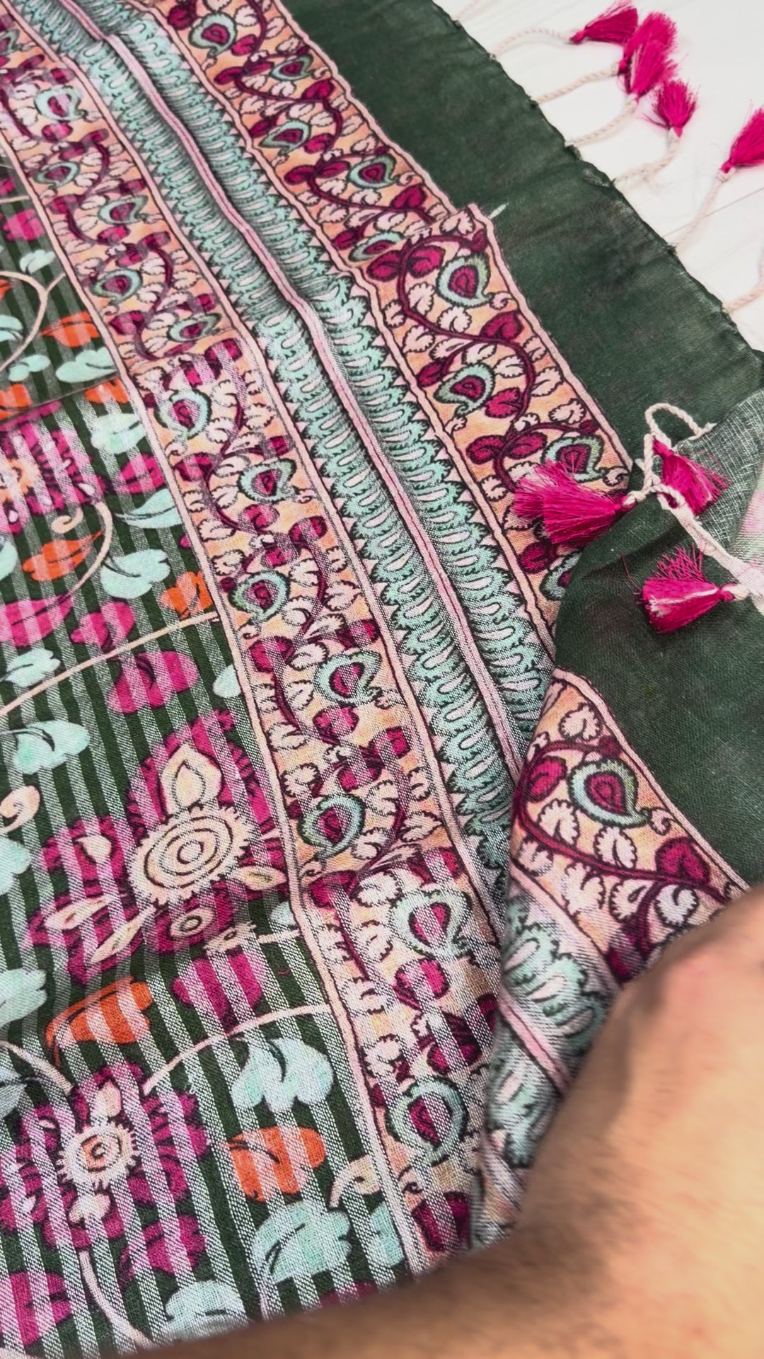 Woven in pure handloom linen, this bottle green drape is adorned with intricate digital pen kalamkari florals across the body. The striking rani kalamkari border adds a bold contrast, making the saree both timeless and refreshingly modern.